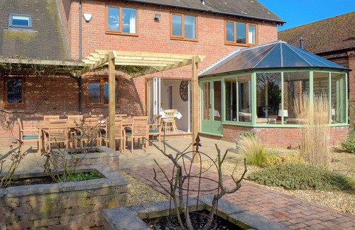Shower Room: Walk-In Shower, Heated Towel Rail, Toilet. Oil central heating, electricity, bed linen, towels and Wi-Fi included. Travel cot, highchair and stairgate available on request. Welcome pack and doggy extras. Large enclosed, lawned garden with patio, garden furniture and gas barbecue. External room with dartboard, garden games and storage for bikes. Private parking for 5 cars. No smoking.. Situated in the pretty village of Harley this detached property enjoys gorgeous views over the surrounding farmland and the ‘Wenlock Edge’. Meadow View is a superb property for families and groups alike. The property has the advantage of a good sized living room and a dining room with a dining table to seat 10 guests. The conservatory provides wonderful views of Wenlock Edge and the large gardens to the rear of the property. There is also a games room on the ground floor with a writng desk, chair, 65" HD TV, Playstation and table football. On the first floor there are five bedrooms, one with en-suite, and a family bathroom with a walk-in shower.