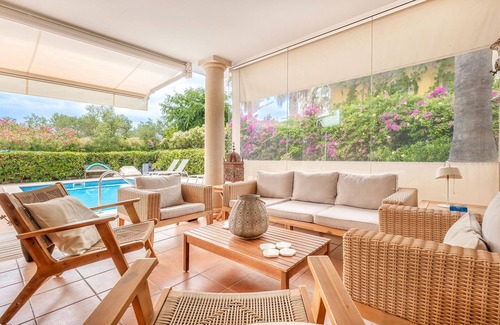 The spacious garden with a private swimming pool invites you to spend relaxing days in the sun. Here you can relax undisturbed, while the idyllic surroundings and the view of the adjacent golf course enrich your holiday experience. Particularly practical: there is a private ford for three cars in front of the house, offering you additional comfort.