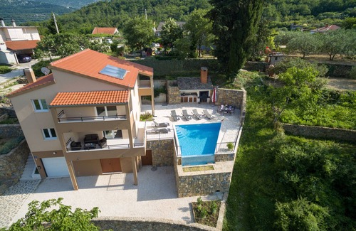 A charming Villa Mosor is your Country and Beach resort at the heart of Central Dalmatia –luxurious residence perched on the small green hill top at the border of picturesque Dalmatian village Smolonje in Omis countryside, only few km from the best beaches and tourist attraction of the Adriatic Coast and from the highway. Scenic infinity pool with 200m2 outdoor lounge area, kitchen and BBQ, self-indulging luxury interior with Jacuzzi/whirlpool and floor heating, en suite bathrooms with balconies, bread delivered in the morning make it an exclusive resort, designated for guests seeking absolute pleasure.Thanks to their large proportions of the property and an extensive variety of luxurious to enjoy, plus excellent central location, this is a great place for entertaining on any scale. You have it all! Choose Villa Mosor for your best holiday ever and keep choosing each day and each minute: peace and quite or attraction and fun of top tourist destinations near by, pool or whirlpool, sea or river, pebble or sand beaches, traditional dalmatian village or roman palaces, medieval fortresses or pirates festival, stone relaxing outdoor lounge and kitchen vs luxurious indoors, top technology picture and free wi-fi connection or a 360° open view of nature and magnificent mountain, shade or sun, relaxing or adventure, sunbathing or playing table tennis, local traditional tavern famous fish restaurants – all in 15 minutes range. You can plan your days as you feel like it. Villa Mosor is just perfect for you! It is especially ideal for a family holiday (two families with children), couples retreat (2-6 couples) or active vacation for a group of people with adventurous and sports spirit.
