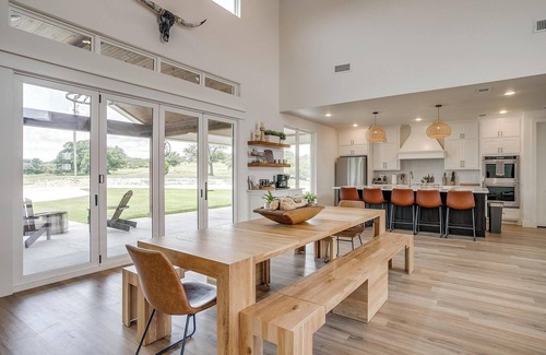 Between the villas is the true heart of Skyview Ranch: the Grand Hall. This light-filled Gathering Room features a modern kitchen, 10-seat dining table, coffee bar, and two bathrooms—making it the perfect space for your group to relax, cook, and come together.