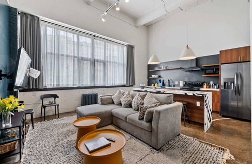 Come and relax in our new location! This historic warehouse was converted into loft units but still holds its original architectural features! Enjoy the industrial modern aesthetic with 15-foot-high ceilings, brick walls, original concrete floors, and atrium skylights. These units come fully furnished and most have full kitchens and all your required accessories for you to just drop your suitcase and start relaxing. **NOW PET FRIENDLY-$50.00 PET FEE PER STAY**
