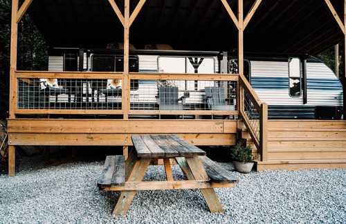 Glamping at its best. Located five minutes away from Dupont State Park! One bedroom, one bath, open concept living room and kitchen. The best part of this property is the outdoor living space which includes a large covered deck, Weber Grill, cozy Adirondack chairs, and a fire pit.