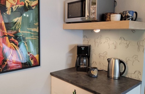 Our kitchenette is designed for simplicity and nourishment. It includes a mid-size fridge/freezer, sink, microwave, single-burner induction cooktop, crockpot, and a versatile toaster/air fryer/convection oven combo. Also included: a coffee maker, grinder, tea kettle, blender, hand mixer, food processor, and spiralizer.