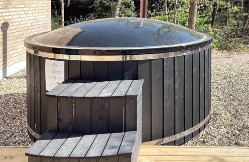 Layout: Kitchen(stove(induction), coffee machine, microwave, dishwasher, fridge, freezer(60-99L)), Living/bed room(TV, chromecast), bedroom(double bed), bedroom(double bed), bedroom(2x single bed), bedroom(2x single bed), bathroom(tumble dryer, washbasin, shower, toilet, washing machine), bathroom(washbasin, shower, toilet), bath tub(outside, heated, 6 persons), sauna(outside, 6 persons), heating(electric), terrace, garden furniture, sun loungers, play equipment, air to water heatpump