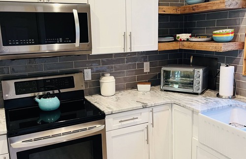 Kitchen - We have a fully stocked kitchen complete with everything you'll need to whip up a quick breakfast or an elaborate dining experience. Appliances include a full sized refrigerator, microwave, electric range with oven and 5 burners, dishwasher, air-fryer/toaster, Mr. Coffee coffee brewer, hand mixer and blender. The house has many of the standard condiments and spices you'll need for your meals. Coffee and tea service is provided along with a complimentary bag of ice for your cooler. Countertops are granite.
