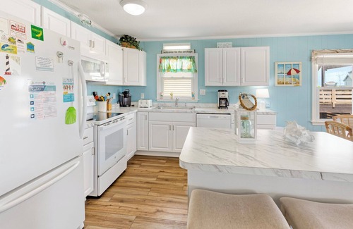 The main level is open, spacious and beautifully decorated. You can't help but to feel relaxed thanks to the comfortable seating and delightful décor in the living room. The fully stocked kitchen is open to the rest of the living area so you can still be with your family even when you are cooking! A convenient kitchen island seats three and the nearby dining table seats six people comfortably. Down the hall, you will find 4 cozy bedrooms with the same gorgeous décor. The first three bedrooms have Queen Beds with ceiling fans for comfort and TVs for entertainment. The final Twin Bedroom is the perfect place for your kids to wind down after a long day of fun in the sun with 2 Twin Beds. Two full-bathrooms complete this level. The covered back deck is ideal for sipping your coffee in the morning while watching the sunrise over the ocean or for gazing at the stars in the crystal-clear skies after dark.