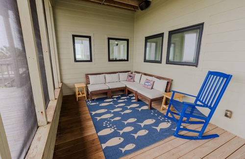 The first floor is a completely open floor plan, perfect for entertaining family and friends. The house is uncluttered and open, allowing for everyone to spread out and find their perfect spot to relax (Personally, I recommend the screen porch). You will enjoy 360 degree views of beach and bay. The house boasts a large modern kitchen with island seating. The kitchen is open to the dining and living areas. There is a large screened in porch off the kitchen with a dining table and couch. It truly is the perfect place to enjoy a morning coffee, listen to the ocean, and watch the pelicans fly over the house.