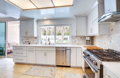 Experience your next desert getaway in style with this upscale 2-bedroom, 2.5-bathroom Indian Wells vacation rental. This radiant single-story house is located in a 55+ community and features a private pool and spa, 2 gas fireplaces, and a wet bar. Start your morning off with breakfast al fresco, practice on the putting green, then aim for par at the Indian Wells Country Club. Spend the day in Joshua Tree National Park and return home to take in the breathtaking mountain views at sunset.