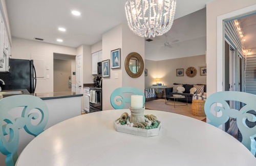 The modern coastal living area features high ceilings, a queen sleeper sofa, a TV, and plenty of natural light through sliding glass doors. The fully equipped kitchen has Corian countertops, updated white cabinetry, and everything you will need to prepare meals during your stay. Overlooking the lagoon, the lovely dining area is the perfect spot to enjoy meals or play board games while taking in the view.