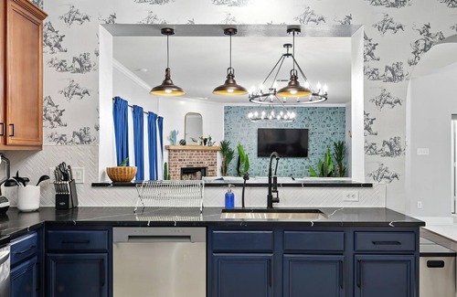 Step into this space and let our southern hospitality wash over you! Tastefully furnished with an oversized sectional, an accent wall with southern motifs, and designer decor, you’ll find yourself immediately relaxing as you soak in the backyard pool views.