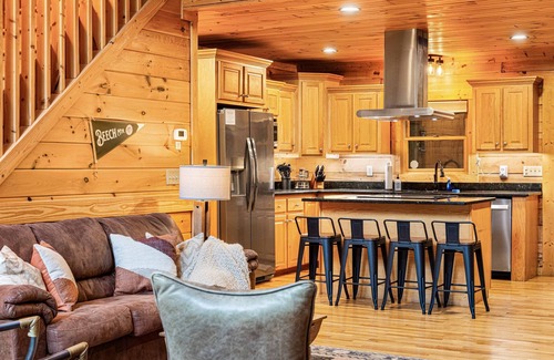 Step into the mudroom at Bear's Creek Lodge via convenient keyless entry and make your way into the open-concept living area with kitchen, dining area, and great room. Settle into the great room’s comfy seating, warm yourself with the electric fireplace, and snuggle up with provided throw blankets and pillows. Exult in the spaciousness afforded by the soaring 25-foot vaulted ceilings and the natural light streaming through huge windows.