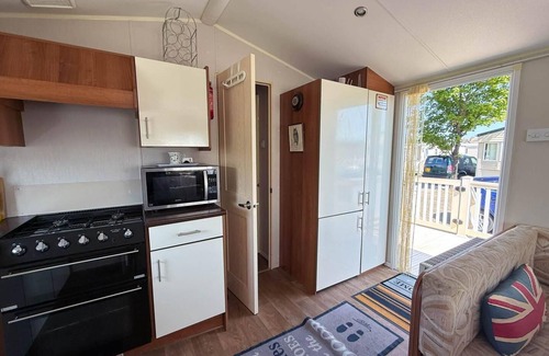 Lovely caravan boasting large outside decking area to enjoy the sunshine. Sited on a great family holiday park and only a short walk from the beautiful beach!