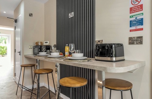 The communal area features a comfortable sofa and 50” smart TV—ideal for relaxing after work. The kitchen is fully equipped with oven, hob, microwave, toaster, fridge freezer, washing machine and a breakfast bar for quick meals and dining. Fast WiFi and smart features like the TV make it easy to unwind or stay connected during your stay.