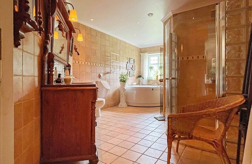 Layout: Pool house: Kitchen(cooker(electric), coffee machine, microwave, dishwasher, fridge-freezer, high chair), Living/bed room(TV, fireplace), bedroom(double bed), bedroom(2x single bed), bedroom(double folding bed), bathroom(floor heating)(washbasin, hip bath, shower, toilet), bathroom(shower, toilet), terrace(garden furniture), garden, geothermal energy, solar energy