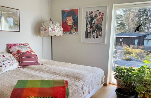 In this beautiful architect-designed house you are one with the water, the house is located on the mountain with a panoramic view and its own jetty with bathing ladder. The large living room has sliding doors to the balcony, just grab a cup of coffee and sit outside to have breakfast with a magical view in front of you. The kitchen and living room have an open plan, only separated by a high bar counter, the great room is made for pleasant socializing for many. There is a large dining table along the glass wall if you want to eat inside, but out on the balcony there are also tables, chairs and a hammock. The owners are interested in art, there is a lot of exciting things to look at and enjoy here. Two of the three bedrooms with double beds have a magical lake view when you wake up, the third has windows to the gable. Two bedrooms are upstairs and one on the ground floor. There are two large fully tiled bathrooms, the one on the upper floor has a shower and bath, the one on the ground floor has a shower and sauna. Upstairs there is a terrace with outdoor furniture overlooking the water. Two rowing boats are included in the rent, one slightly larger and one smaller, great for a spontaneous rowing trip or catching a couple of fish to grill for dinner. A Canadian is also included in the rent. For those of you who enjoy hiking, there are plenty of nice hikes and forests in the area. Färentuna is part of the Eker Islands, there is a lot to discover and experience here. If you want to get to Stockholm, the bus goes 1 km from the house. You can also take the bus or car to Ekerö Centrum and take a boat into Stockholm, a beautiful archipelago tour. This house is for those of you who appreciate a beautiful, well-built house with all amenities and with its own plot of land.