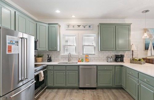Sea Blessings is a stunning home with four bedrooms and four baths accommodating up to eleven. Professionally decorated and grand by all accounts, the beautiful finishes and elegant touches in this luxurious home invite you in for a unique experience. A lovely front porch welcomes you with plentiful seating around a gas fire pit, the perfect spot for sharing the day’s adventures. Plush furniture awaits in the living room with seating for all to convene for a movie on the large, built-in flat-screen TV. Gather around the extended dining table or at the breakfast bar for meals and snacks. Floor-to-ceiling windows bring in plenty of sunshine and filtered light, quietly encouraging the outdoors inside. The fully appointed kitchen, equipped with top-of-the-line stainless steel appliances, affords plenty of counter and cabinet space and a Keurig coffee pot for your morning brew!
