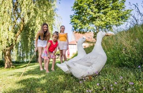 Die geräumige 3-Zimmer-Wohnung (65qm) ist Teil eines liebevoll restaurierten Gebäudes mit romantischem Kreuzgewölbe. Im großzügigen Wohnzimmer finden Sie eine Couch, einen Sat-Fernseher, eine Essecke und eine voll ausgestattete Küchenzeile. In den beiden Schlafzimmern befindet sich je ein Doppelbett. Das Badezimmer verfügt über Dusche und WC. Zudem gibt es ein weiteres, separates WC. Unser bewirtschafteter Bauernhof - direkt am Regenfluss - ist ideal für Wasserratten, Bootsfahrer und Angler. Der Abenteuerspielplatz und die beheizbare Spielscheune bieten für Kinder eine optimale Abwechslung. Bettwäsche, Handtüchern, Strom und Wasser, Endreinigung und WLAN-Nutzung sind im Preis enthalten. Brötchenservice mit hofeigenen Erzeugnisse wie Eier, Honig und Marmelade möglich.