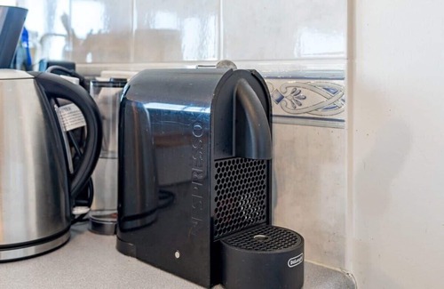 Beautiful large kitchen, electric cooking, dishwasher, Pod coffee machine, microwave, kettle, toaster, breakfast bar with three stools and plenty of cupboard space.