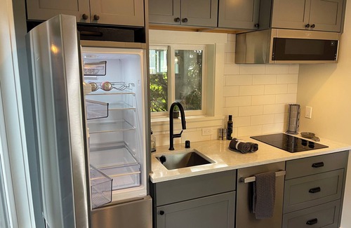The modern kitchen, bath with deep soaking tub, & additional cozy patio that extends your kitchen living space to the outdoors, make for the perfect tranquil retreat.