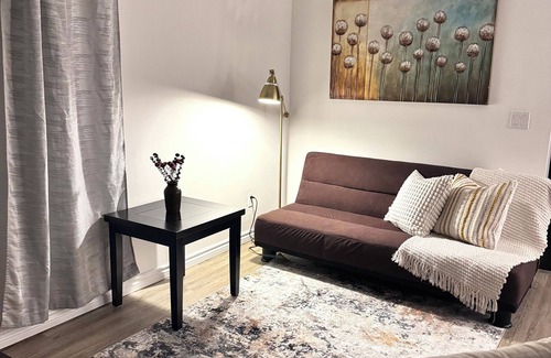 The suite features a comfortable queen-sized bed and a sofa bed, making it perfect for couples or small families. The living area is equipped with a flat-screen TV and Chromecast, so you can stream your favourite shows. You'll find a fridge, microwave, and essential kitchenware for preparing light meals and snacks, along with a coffee maker with complimentary coffee and tea. The private 3-piece bathroom includes fresh towels and toiletries. Enjoy the convenience of a private entrance and self-check-in. Free Wi-Fi and street parking are also available for your convenience.