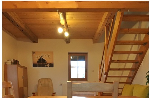 Green and quiet on the Alpakahof Gaias garden located our apartment (maisonette) on 70 sqm comfortably offers plenty of space for 2 guests (in the special case can accommodate up to 4 people). Upstairs is the living room and bedroom with large corner sofa, in the basement is the living room with open kitchen and sofa bed, and the daylight bathroom with tub.