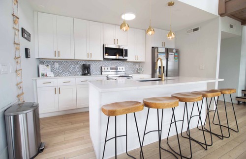 One of Folly's Best! Oceanfront Nest is a brand-new oceanfront showstopper! Boasting 7 bedrooms and 5 bathrooms this duplex can accommodate 14 guests comfortably. Both units have a complete kitchen dining laundry and living room. Kitchens are equipped with all new stainless-steel appliances and granite countertops and all bedrooms come with Smart TVs for your enjoyment. In total there are 5 king beds and 2 queens with both units combined. Follow the spiral staircase up to the third floor to behold a master loft with its own en suite bathroom and ocean views. Spend your days lounging on the expansive back deck or take advantage of your own private access point to the beach! The views are breathtaking and can be relished from inside and outside of this property. Parking is off street and private and there is a small yard in front of the home. Every aspect of 1701 E Ashley ensures a truly luxurious vacation experience that you will not want to miss! Oceanfront Nest allows up to 6 well-behaved, house-broken, flea-treated dogs with approval. Please include the breed and size of your dogs when you inquire. All photos are current and accurately depict the property. Please book with confidence. This property is licensed by the city of Folly Beach as a vacation rental - Business License Number: LIC008874/LIC008875. Because of the potential of fraud we would not recommend booking a property not licensed by the city of Folly Beach as a vacation rental.