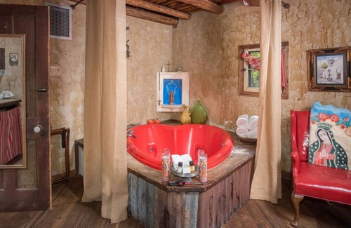 Mexico is designed to look like an aristocratic Mexican bungalow. It has weeping plaster walls and a latillo ceiling. There is a lion’s cage door turned sideways to make a headboard on the queen-size bed. The feature point of this room is a red, two-person heart shaped Jacuzzi tub for two, which is backed up into a corner beneath a Virgin of Guadalupe Shrine. Draperies conceal the bathing area. This cabin has Mexican tile and a hand painted Mexican sink and a large back porch with a hammock. Breakfast is included.