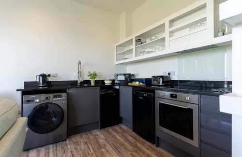 Contemporary second floor apartment with a balcony overlooking the pretty communal gardens towards the sparkling ocean. Living space features sofa, two feature chairs, Smart TV, and sliding doors to the terrace with sea views. Open plan kitchen/diner space with dining table and two benches seating four. Fully equipped kitchen features electric oven, electric hob, single fridge with freezer compartment, microwave, washer/dryer, dishwasher and sea views. Travel cot and highchair available. Underfloor heating throughout.