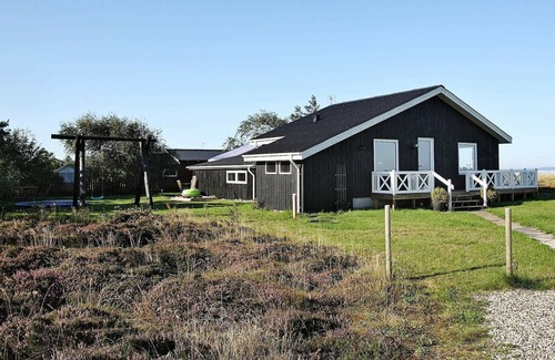 Holiday cottage with a closed garden with panoramic views of the Limfjorden that has a good beach. You have panoramic views from both plot and house. The house has comfortable furniture, living room with TV with satellite, DVD player, CD player and a heat pump has been installed for easy and comfortable heat control. One of the bedrooms is a passage to another room. From the large, bright living room you have access to the terrace where you can have barbecues and enjoy the sunsets across the Limfjorden. Well-equipped kitchen with dish washer, ceramic cooker and fridge/freezer. The bathroom has whirlpool and underfloor heating. The house is very child-friendly with cot and high-chair and outside you will find swings, sandpit and trampoline (usage at own risk/insurance). The plot is fenced so the dog can run freely.