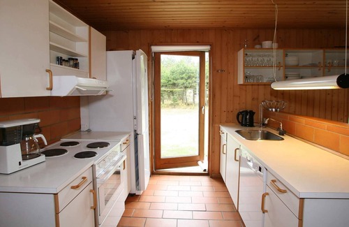 Layout: open kitchen(cooker(electric), hood, coffee machine, microwave, dishwasher, freezer(1-59L), fridge-freezer, washing machine), Living/bed room(25 m2)(TV(satellite, german television channels, danish TV channels (DR1 and TV2)), radio), bedroom(double bed, children's bed, high chair), bedroom(double bed), bedroom(2x single bed), bedroom(2x single bed), bathroom(floor heating)(bathtub or shower, washbasin, toilet), sauna(indoor, heated, 2 persons), heating(electric), terrace(roofed), garden furniture, play equipment, air to air heatpump