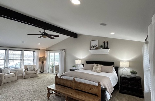 Welcome to Stone Creek Stables. Relax and unwind watching the beautiful sunsets from the front porch on this 80 acre private horse farm. Located just outside of Crestwood, ky , 30 minutes from Church Hill Downs, 25 minutes from Louisville Airport, 15 minutes from restaurants and shopping, and 10 minutes from Valhalla golf course. Stone Creek Stables is a unique opportunity to experience staying on a Kentucky horse farm, with a few added bonuses. Imagine waking up and enjoying a cup of espresso on the front porch as you overlook rolling green pastures with horses and wildlife. Guests are welcome to hike on the property’s wooded trails, go kayaking/ paddle boarding on the small lake adjacent to the house, or enjoy the indoor basketball court. If relaxing is your goal, you can lounge by the pool, or nap on the swingbed. In the evening you can sit by one of the three outdoor fire pit areas and stargaze. Guests can also unwind in the six person hot tub, or relax in one of the homes two sunrooms. The main house is a 4500 sq. ft. Farmhouse style Ranch with three cozy living rooms & ample comfortable seating. The main house features 5 bedrooms, 3 and 1/2 baths all on one floor, so no stairs to hassle with. The master bedroom and bathroom are set apart from the other four bedrooms and bathrooms. All bedrooms feature new linens, memory foam mattress, additional seating and sound machines. The kitchen is well stocked for cooking with a double oven, under counter ice maker, full size refrigerator and full size freezer. The two inside dining areas seat 10 to 12 guest each and the adjoining living room features an 85 in. TV, perfect for watching movies. The outdoor pool deck can accommodate your whole group between the dining table and outdoor entertainment area. The lower house level has a ping pong table, foosball table, large tv and comfortable sectional.