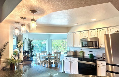 In the kitchen nook there's a table with 6 chairs and in the family room there's another table with 4 chairs where games can be played, or used for office space, or used as another option for eating at. There's a Keurig coffee maker that can make a pot or cup of coffee. You will find all you need to cook up a gourmet meal. If you see anything missing, please let us know. We want to be stocked with everything you can possibly want in a kitchen.