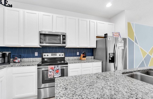 The gourmet kitchen is complete with granite counter tops, and a large island with all stainless steel appliances. This is one of the larger homes in Solterra Resort so you will enjoy 2 refrigerators and 2 dishwashers for all your groups needs. You are all ready to make a delicious meal with a full pot and pan set, toaster, 3 types of coffee maker (Keurig, standard drip and Pour Over), crockpot, rice maker, and of course a mickey waffle maker! All this with views of the Great room, Dining room, Pool area and Breakfast nook.