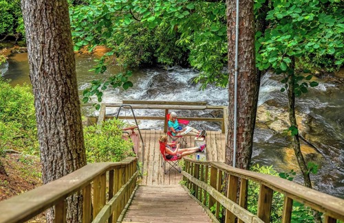 This suite also offers Convenient day and night access to the large recreation deck (propane gas fire pit, tables with umbrellas, chairs, rocking chairs, and even a cornhole game). From this deck, step onto a wooded trail winding down to the riverside and waterfall. Lay directly in the falls, relax in the water, or simply enjoy the sounds and scenery! There is also a mountainside staircase leading to an observation deck which provides a beautiful full view of the large waterfall on the south side of the Inn.