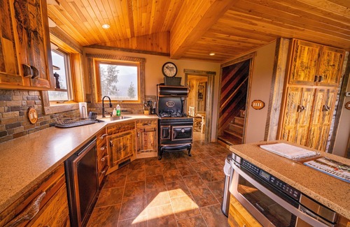 There's a large wood stove in the great room with plenty of cut firewood at your disposal, a foosball table and antique style record player with a nice collection of old vinyls, a hidden TV with a collection of movies, and a fire pit outside for roasting marshmallows while listening to the elk bugle.