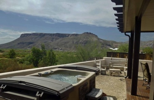 The house is a two-bedroom, two bath luxury condominium with a comfortable living room, dining area, fully stocked kitchen, laundry room, and an amazing backyard with a shaded porch, fire features, four person hot-tub, and breathtaking views of the Rio Grande, mountains, and into Mexico.