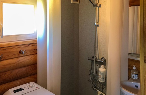 A beautiful and very well maintained log cabin in the middle of the cozy vacation region Hovborg Ferieby. The cottage is equipped with a good kitchen-living room with access to bathroom, bedroom and loft. A nice, large wooden terrace leads around the house, so you can enjoy the sun all day. There is also an arbor with garden furniture and barbecue.
