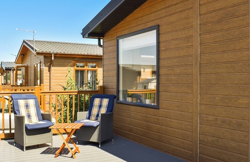 Bathroom: Bath With Shower Over, Toilet. LPG central heating, gas, electricity, bed linen, towels and Wi-Fi included. Cot. Welcome pack and doggy extras. Enclosed garden with sitting-out area, wraparound terrace and garden furniture. On-site children’s play area, funfair, crazy golf and golf simulator bays (shared with other properties on-site). Fishing on-site (adult £8 per adult rod or £10 for 2 rods, child £5 per rod). Private parking for 2 cars. No smoking. Please note: There is a fishing lake in the grounds.. The perfect place for a family fun holiday or a quiet break in the countryside. This 2023 light and spacious two-bedroom, two-bathroom lodge is situated on the beautiful Stonham Barns, set in 110- acres of picturesque countryside. There is a fully fitted kitchen and the living room offers the perfect place to sit and read, watch TV or play family games. Outside is a large terrace area which is fenced off and is the ideal place to sit and relax with a book and your favourite tipple or watch the fishermen on the lake opposite.