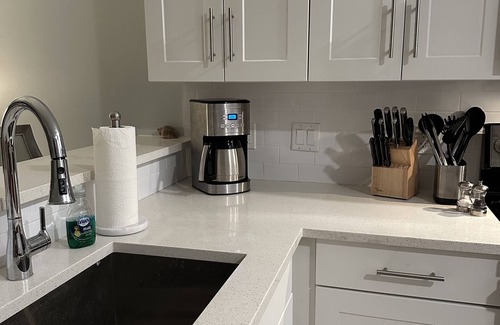 The large master bedroom (king bed) has a private ensuite, TV, seating area and a view of the grounds and ocean. The second bedroom (queen bed) also has its own adjoining bathroom. The third bedroom (queen bed) has easy access to the bathroom and shares it with the fourth bedroom (queen pull out sofa.) Also, there is a pack and play and a fold out twin foam mattress for children. There is filtered water available in the kitchen as well as dishes, silverware, water and wine glasses for 12. The kitchen is complete with cooking utensils, pots and pans, and small appliances including blender, air fryer, toaster, and non-Keurig coffee maker that uses ground coffee and has a reusable filter. All linens are provided.