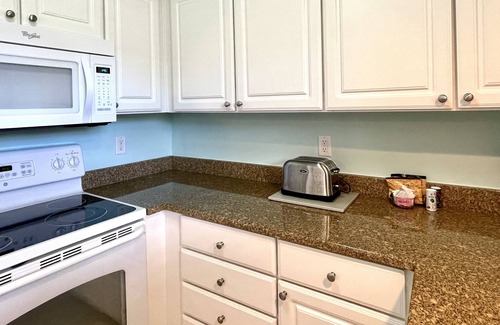 - Beautiful kitchen with clean granite countertops and bright white cabinets. All the essentials are provided, coffee pot, filters, Keurig with pods, sugar, creamer, teas, pots, pans, spices, grilling tools, tea pot, blender, etc.