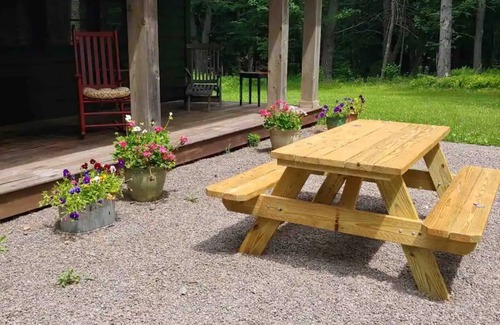 Gather around the gas floor to ceiling fireplace, while you cook, eat, and relax. Back deck has big picnic table, umbrellas and a grill. Front porch is a perfect place for a morning cup of coffee and bird watching, with our great collection of bird houses. Board games abound for friendly competition. Perfect place for groups of friends, kid friendly. No furry family members (pets) allowed, due to allergies.