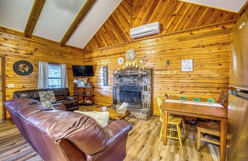 The warm and welcoming living room features a wood-burning fireplace, perfect for relaxing after a day of outdoor adventure. Step outside to enjoy a true cabin experience with a grill for evening cookouts and a fire pit for cozy campfires under the stars.