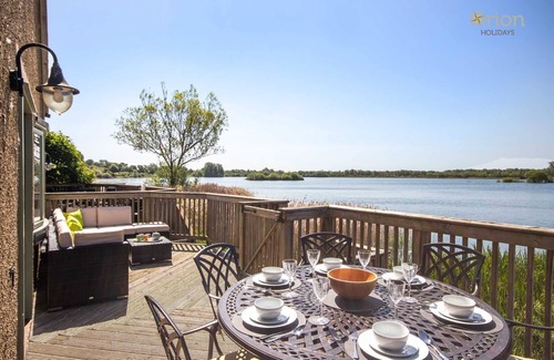 Sleeping 6 with 3 bedrooms. 1x double ensuite, 1x double (can be a twin), 1x twin, 1 family bathroom & downstairs WC. The open plan living area leads to a large south facing deck with panoramic views of Somerford Lagoon, seating & gas BBQ. Pets welcome.