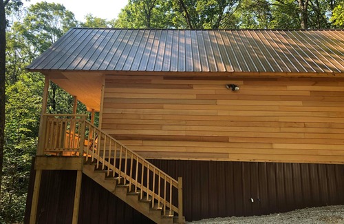 This cute little cabin sits down in a wooded holler near Winslow, AR, is 10 minutes from Devils Den State Park, and just 25 minutes from Fayetteville. Enjoy the quiet, peaceful woods with the amenities of a "tiny home" style cabin. BBQ grill, firepit, and picnic table at each cabin. Perfect for a quiet getaway for 1, 2 or the whole family. Great for a Razorback sports events and more. The front porch rocker has a beautiful view. The pond is fun for fishing, riding the "peddle boat" or a kayak. The playground is waiting for the kiddos. There are 6 cabins available so share with your family and friends and have a great gathering for the weekend. The cabin has WIFI, is stocked with linens, dishes, a smart TV & DVD player. You can easily get a data signal on your phone.