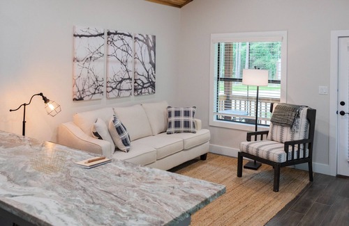 Each of our waterfront cabins feature a back porch right off the bedroom with a gorgeous view of Rocky Creek. Complete with a full kitchen with refrigerator, this cabin is perfect for cocooning for a weekend or even an extended stay. The couch in the living area folds out into an additional bed, making these cozy cabins perfect for families. The kitchen includes a stove top, microwave, refrigerator, coffee maker, toaster, pots, pans, cooking utensils, place settings and eating utensils. This cabin also has a propane gas grill. Sleeps 4. Smoking and pets are not allowed.