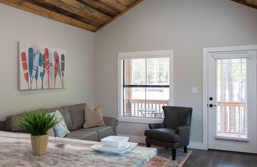 Each of our waterfront cabins feature a back porch right off the bedroom with a gorgeous view of Rocky Creek. Complete with a full kitchen with refrigerator, this cabin is perfect for cocooning for a weekend or even an extended stay. The couch in the living area folds out into an additional bed, making these cozy cabins perfect for families. The kitchen includes a stove top, microwave, refrigerator, coffee maker, toaster, pots, pans, cooking utensils, place settings and eating utensils. This cabin also has a propane gas grill. Sleeps 4. Smoking and pets are not allowed.