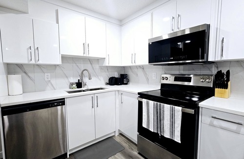 This newly built unit has two spacious bedrooms with closets, a well-stocked bathroom, a welcoming living room, a dining area, a full kitchen, and a private laundry room. Each bedroom includes queen-sized beds, reading tables, nightstands, and bedside lamps to make your stay even more comfortable.