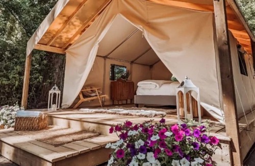 Oceans Edge Eagle Resort has luxury glamping tents available on large wooden decks wood-burning stoves, private deck space front and back of the tent, and outdoor firepits.