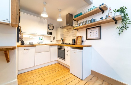 When it’s time to catch some rest, head to the dreamy double bedroom, featuring funky lighting and a handmade wooden bed. A good night’s rest is assured as the bedroom overlooks the quiet garden. A contemporary, slick bathroom with an over-bath shower, heated towel rail and trendy decoration completes this fantastic holiday home.