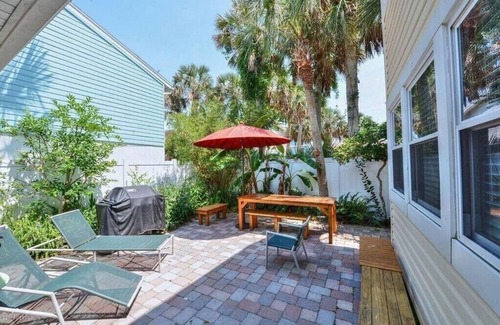 Four bedroom, three full bathroom, charming Soho beach house is perfect for families. This house is located in a residential neighborhood where most people live full-time and is not suitable for groups of young Spring Breakers. The property is maintained as the owner's home, not in the manner of most short-term rentals. The house has a gorgeous open floor plan of living room, dining room, and kitchen with dramatically vaulted ceilings and exposed beams. Gigantic master suite with garden tub, walk-in closet, den area with twin daybed, and office space. Charming notty pine -- wood floors, walls, and ceiling, but updated bathrooms and kitchen. Large, fully-appointed kitchen with polished stone counter tops and all the dishes, pans, silverware, appliances, and utensils a family could need. Adorable private, fenced back yard with rustic table and benches that seat ten; nicely landscaped. Backyard has gas grill, chaise lounges, and additional patio furniture as needed in garage. Outdoor shower with hot water. Steps from beach (one-half block). Can hear waves crashing from yard and master bedroom windows. Three additional bedrooms: one downstairs with a queen-sized bed; and two upstairs with queen-sized beds. New couches in living room. 55" wall-mounted tv on swivel, curved screen television in living room, and three additional televisions in bedrooms, all with U-verse. Washer & dryer in garage. Two-car garage; three cars can park in the driveway. Tastefully decorated and comfortable. Central air conditioning with separate units and separate thermostats for main floor and upstairs (three bedrooms and two full bathrooms upstairs). Quiet, private feel, although a short (less than two mile), safe, easy bike ride to busy downtown JAX beach with restaurants, bars, and shops. Walking distance from great restaurants, boutiques, and coffee shops. Less than a mile from upscale, famous-for-golf Ponte Vedra. Free wi-fi. Professionally managed and cleaned. All white towels and linens provided. All natural environmentally safe cleaning products used. Beach cruisers provided. Beach towels, chairs, and toys provided. Twenty minute beautiful drive down the old coastal highway to St. Augustine. A mile from Guano Tolamato Matanzas National Nature Preserve. Thirty minutes to Mayport, Timucuan Ecological and Historical Preserve, and Amelia Island. Local manager available 24/7 for any questions or recommendations. When you visit, you are family. We make sure you have everything you need to make your family vacation perfect.